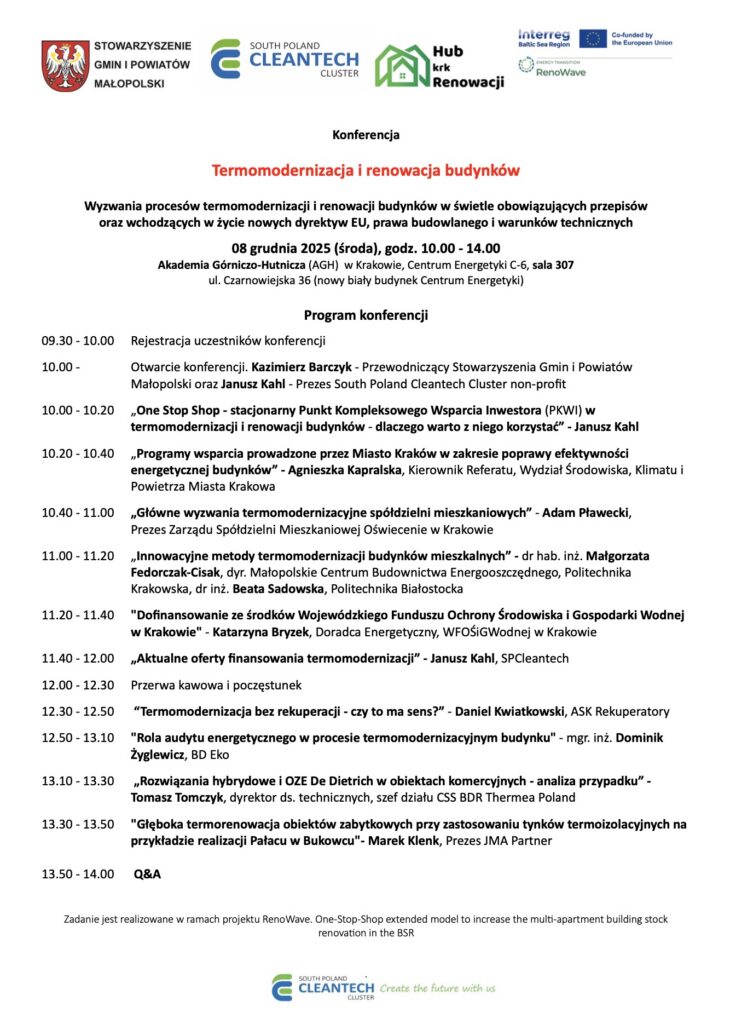 W dniu 08 grudnia 2025, OSS krk HubRenowacji, jako inicjatywa w ramach SPCleantech zorganizował na Akademii Górniczo-Hutniczej (AGH) w Krakowie już 6. cykliczną konferencję „Termomodernizacja i renowacja budynków – najnowsze tendencje rynkowe – Wyzwania procesów termomodernizacji i renowacji budynków w świetle wchodzących w życie nowych dyrektyw EU, nowego prawa budowlanego oraz warunków technicznych”.