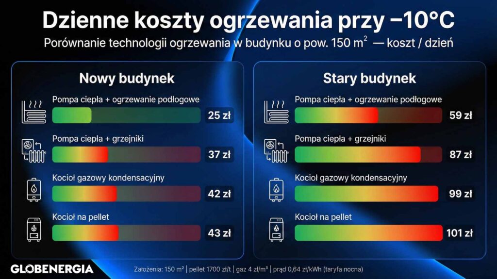 Dla porównania, w nowym budynku z nowoczesnym kotłem węglowym mówimy o kosztach rzędu 35-40 zł dziennie. To już poziom zbliżony do pelletu, ale nadal droższy niż pompa ciepła, która dodatkowo nie generuje lokalnej emisji i nie powoduje smogu.