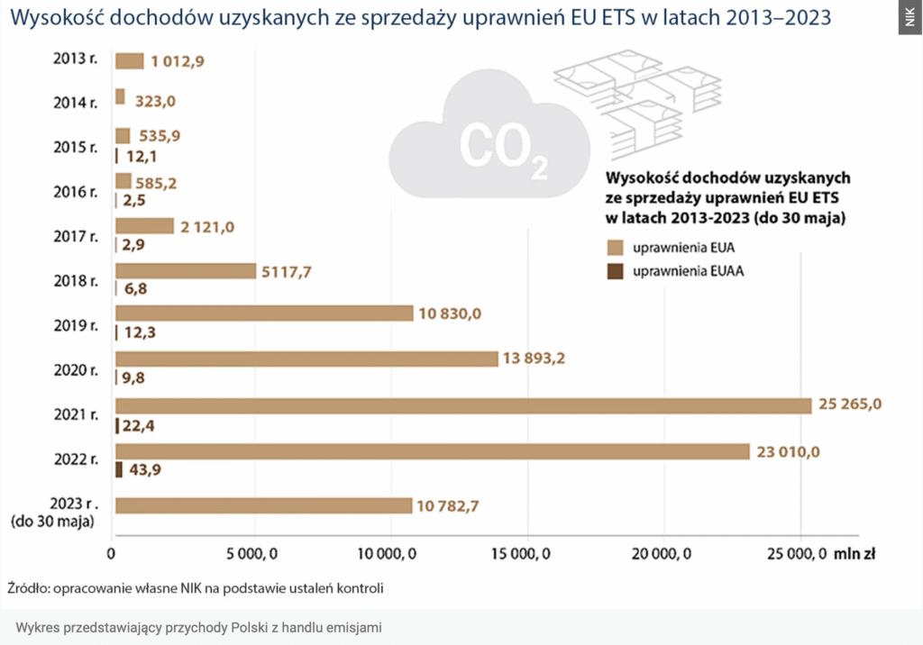 Polska jako kraj oparty przede wszystkim na węglu, przez lata był w czołówce państw UE, którym przysługiwało najwięcej środków za prawo do handlu emisjami CO2 i innymi gazami cieplarnianymi. W latach 2013-2023 otrzymaliśmy 94 mld zł, z czego większość tej kwoty (84 mld zł) uzyskaliśmy w latach 2019-2023.